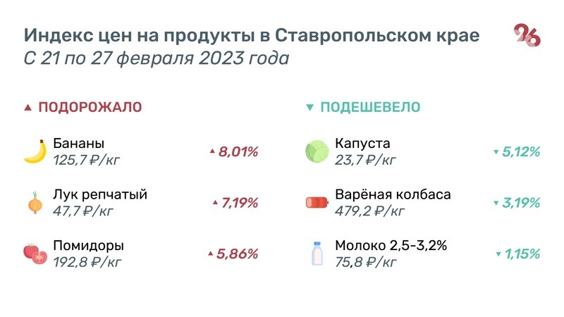 По данным мониторинга, с 21 по 27 февраля бананы на Ставрополье подорожали на 8,01% — до 125,7 руб. за кг, лук — на 7,19% — 47,7 руб. за кг, а помидоры — на 5,86%. Сейчас килограмм томатов можно купить в среднем за 192,8 руб. Помимо этого, цены на 4,09% выросли на свёклу — 42,3 руб. за кг, а также на консервы из овощей для детского питания. Их цена поднялась на 3,69% и составляет 689,7 руб. за кг.
