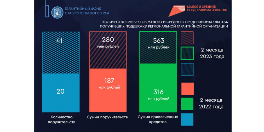 За 2 месяца 2023 года более 563 млн рублей получил малый и средний бизнес под поручительства региональной гарантийной организации, что почти на 250 млн рублей больше, чем годом ранее. Всего же было выдано 41 поручительство на сумму порядка 280 млн. рублей. В 2022 году за аналогичный период этот показатель составил 20 поручительств на сумму 187 млн. рублей.
