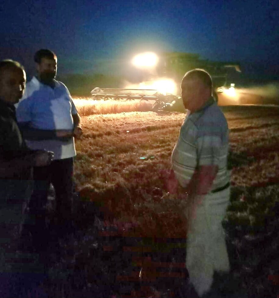 В хозяйстве работало 8 комбайнов, проводили обмолот озимой пшеницы сорта Тимирязевка, урожайность которой составила 42 ц/га.