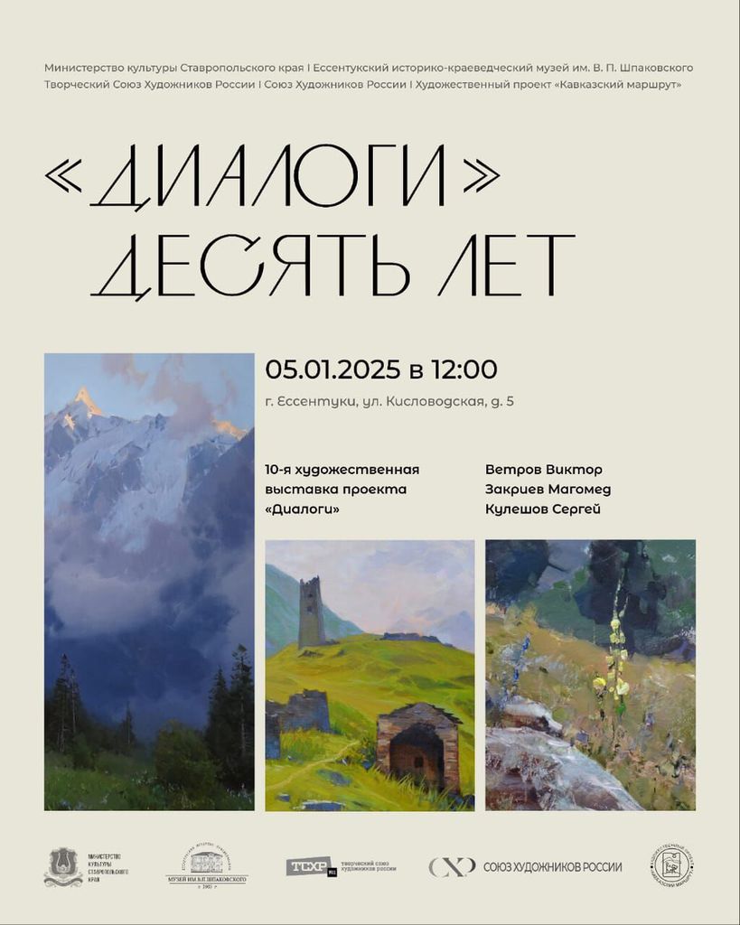 Музей города-курорта с гордостью анонсирует открытие юбилейной – десятой – выставки «Диалоги», на которой будут представлены работы трех мастеров: Виктора Ветрова, Сергея Кулешова и Магомеда Закриева. Эта экспозиция – творческий отчет художников, живопись которых объединяет общая тематика – величественные, суровые и манящие красоты Кавказа. На выставке будет представлено более 60 неповторимых пейзажей.