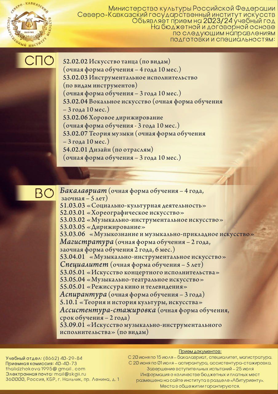 18 марта 2023 года в 10.00 в большом зале Северо-Кавказского государственного института искусств (г. Нальчик, просп. Ленина, д.1) для будущих абитуриентов состоится День открытых дверей.