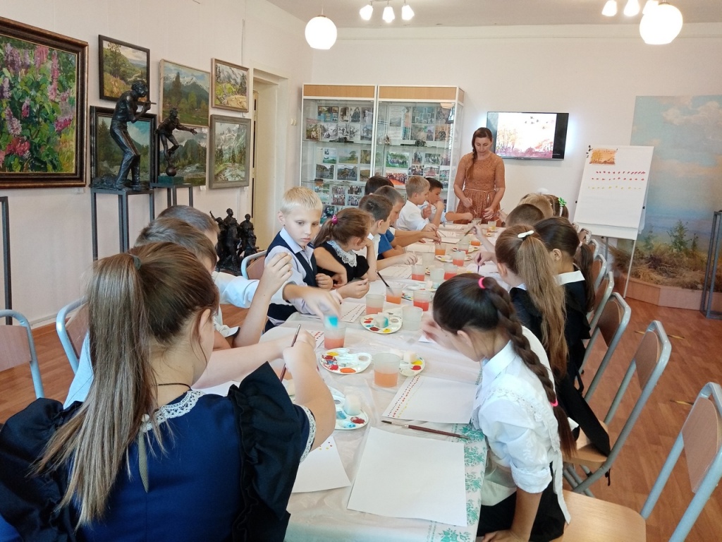 Научный сотрудник Д.Ш. Махова провела мастер-класс по рисованию в технике мокрой акварели. Школьники изобразили осенний лес.