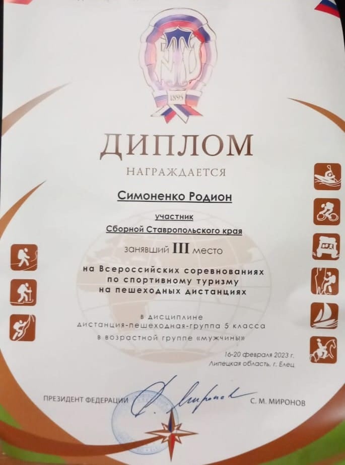 В составе сборной команды Ставропольского края в соревнованиях принял участие Симоненко Родион, обучающийся Центра дополнительного образования Георгиевского городского округа, объединение «Высота»,руководитель Красин А. С. Родион занял 3 место в дисциплине «дистанция пешеходная -группа» 5 класса.