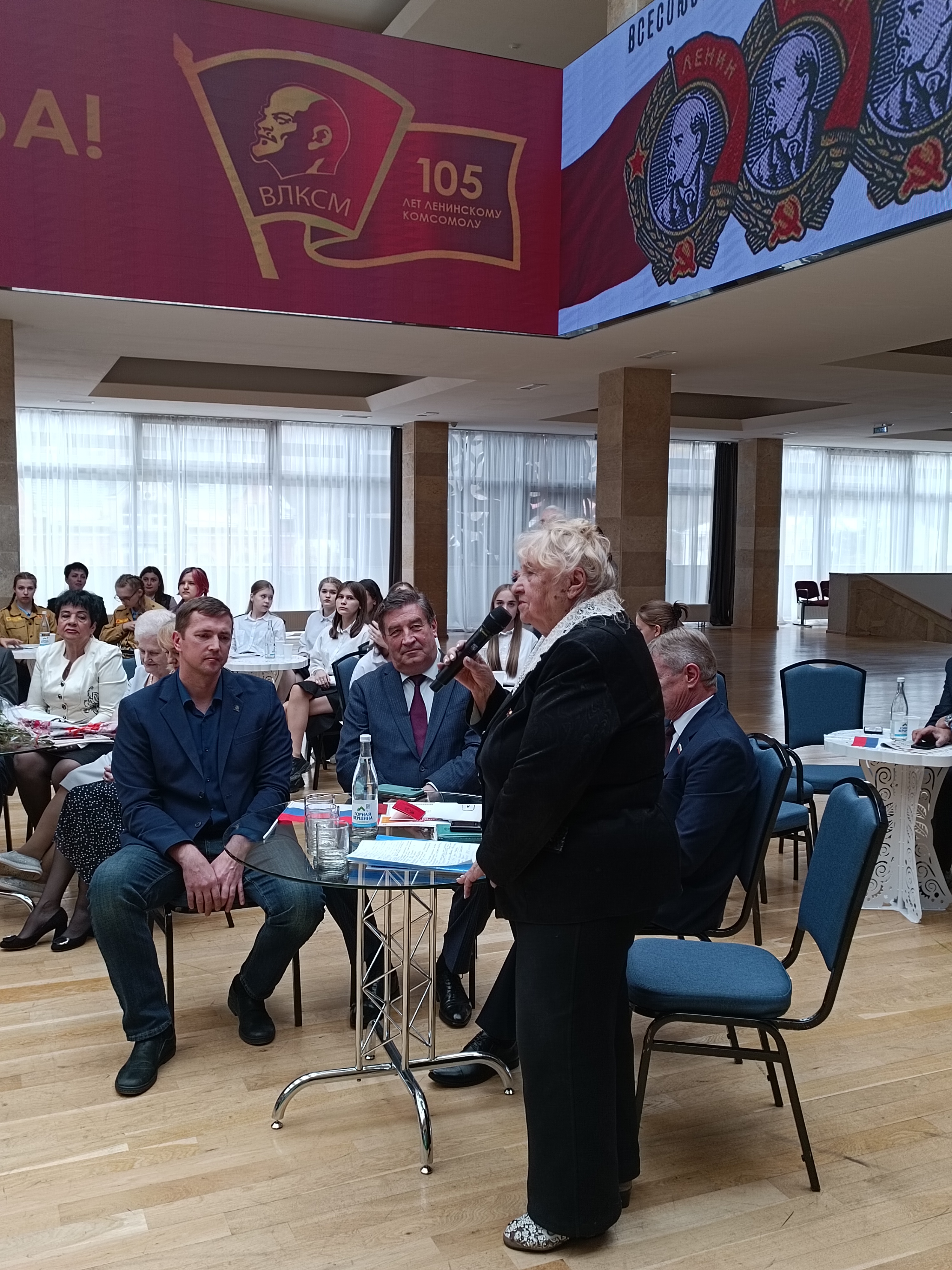 На экранах- юбилейная надпись, ордена комсомола, эмблема, девиз… В фойе расположилась выставка, подготовленная коммунистами, комсомольцами советского времени, членами ЛКСМ современной России.