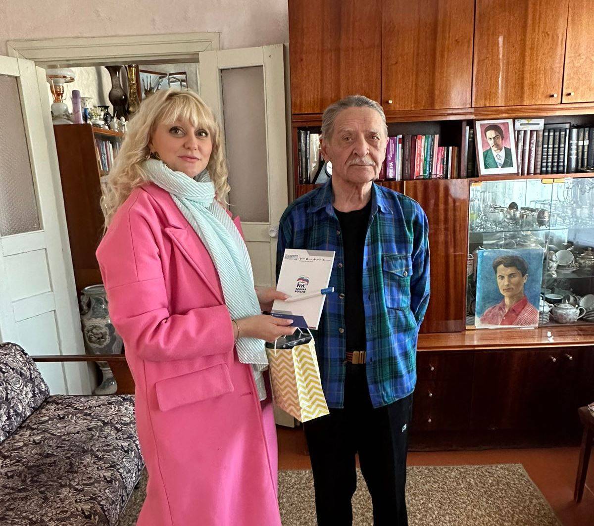 По случаю депутат Думы Кировского городского округа, исполнительный секретарь местного отделения партии Наталья Терехова вместе с начальником отдела по работе с молодёжью Еленой Иванниковой приехали с подарками к почётному гражданину города Новопавловска, лауреату Губернаторской премии имени А. Губина, писателю, награждённого медалями «Ветеран труда», «За трудовую доблесть», «За доблестный труд», «За заслуги перед Ставропольским краем» Ивану Аксенову и его супруге Полине.