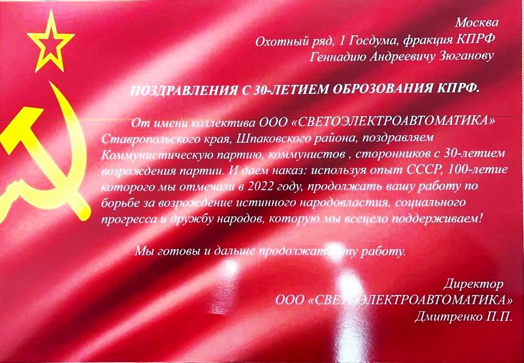 Предприятия, организации и отдельные жители Ставропольского края поздравляют Г.А. Зюганова и всю КПРФ с 30-летием