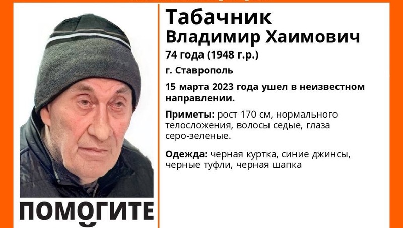 В среду, 15 марта, 74-летний житель столицы Ставропольского края Владимир Табачник ушёл из дома в неизвестном направлении и до сих пор не вернулся.