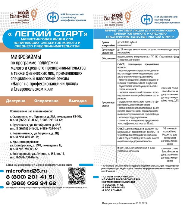 В целях повышения информированности начинающего предпринимательства, а также физических лиц применяющих специальный налоговый режим «Налог на профессиональный доход» в Ставропольском крае, предоставляется информация о деятельности некоммерческой организации микрокредитной компании «Фонд микрофинансирования субъектов малого и среднего предпринимательства в Ставропольском крае», а так же мерах поддержки начинающим предпринимателям.