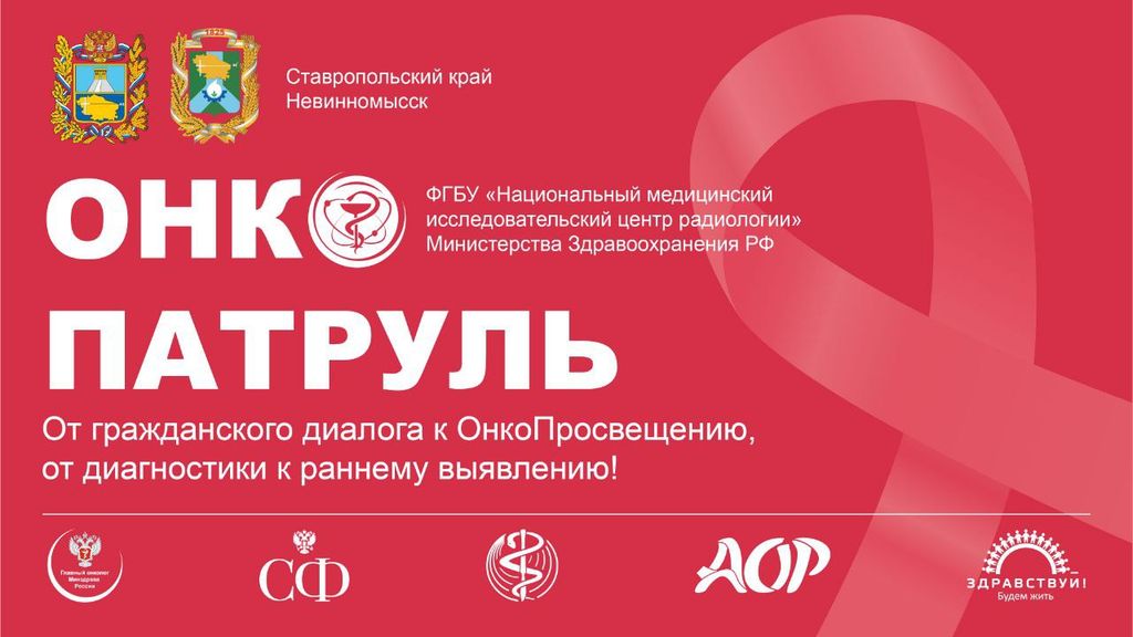 Завтра, 25 апреля, по поручению и при поддержке Губернатора Ставропольского края Владимира Владимирова в Невинномысске, в единственном городе России, во второй раз будет находиться всероссийский информационно-просветительский проект «Онкопатруль».