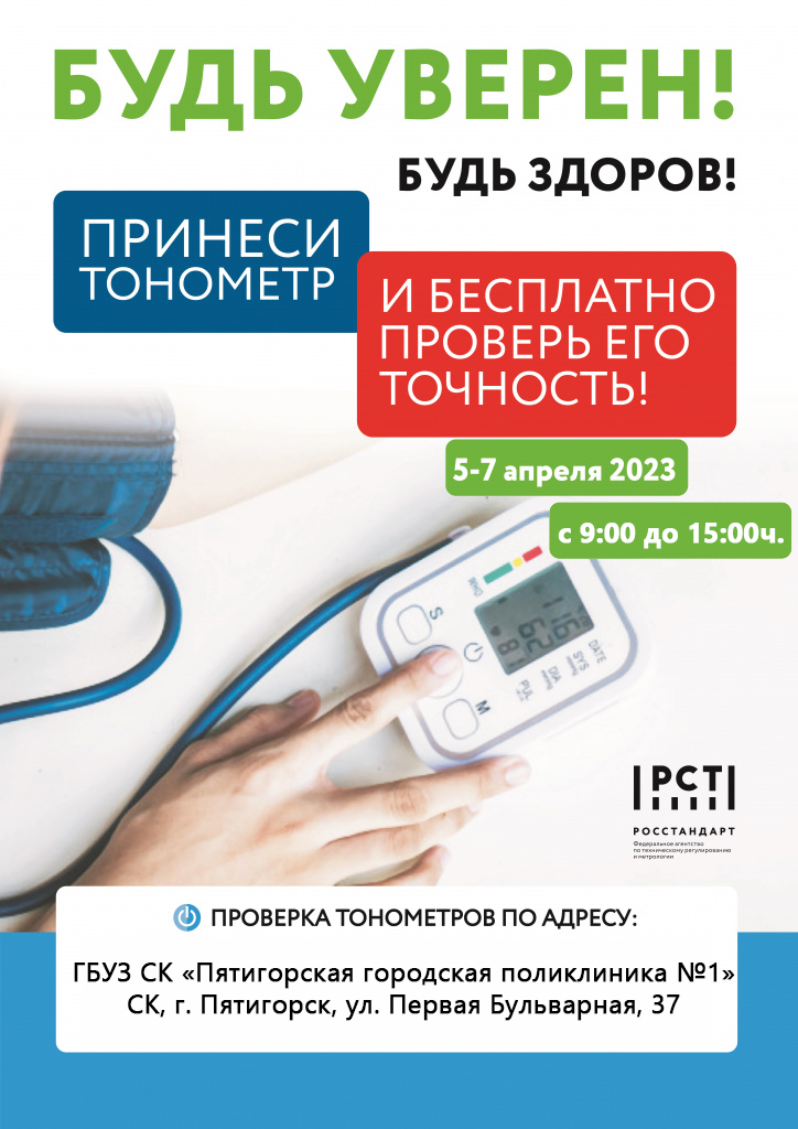В дни акции, с 5 по 7 апреля, специалисты ФБУ «Северо-Кавказский ЦСМ» Росстандарта, на безвозмездной основе, будут вести прием граждан для проведения контроля выходных параметров бытовых тонометров артериального давления, используемых населением, в ГБУЗ СК «Пятигорская городская поликлиника №1» с 9.00 до 15.00 часов.