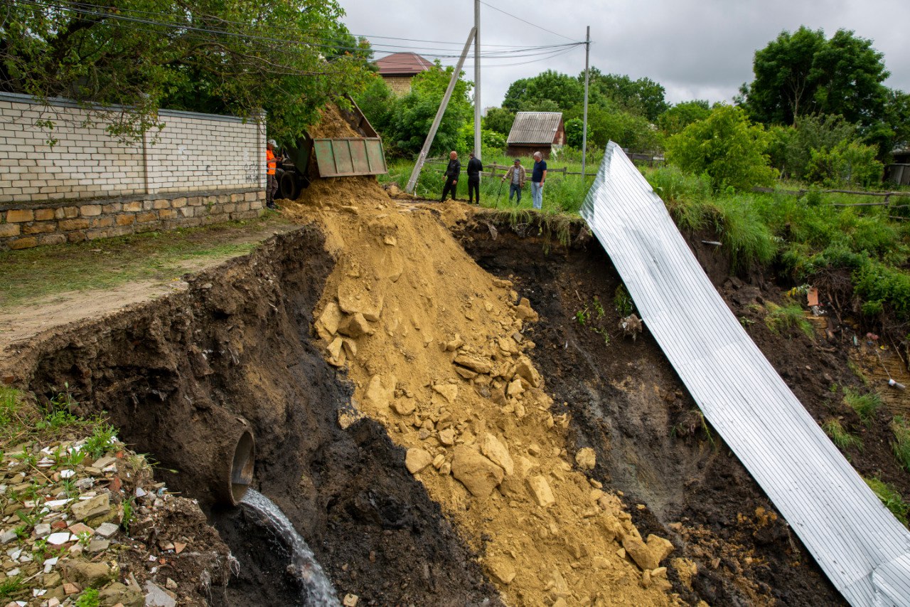 Отмечено, что больше всего пострадал от стихии тупик Монастырский в Октябрьском районе. Напомним, здесь требует ремонта аварийный ливневый коллектор, из-за оползня обвалилась часть грунтовой дороги и участок пешеходной части. В зоне активного смещения грунта оказались 14 домовладений и 34 человека. Жертв нет, жилые помещения не пострадали. Обвалившийся участок дороги составляет 20 метров. Для жителей домов, к которым ограничили доступ, организовали временный путь. Также предстоит отремонтировать около 80 метров трубы коллектора, укрепить склон и засыпать овраг.