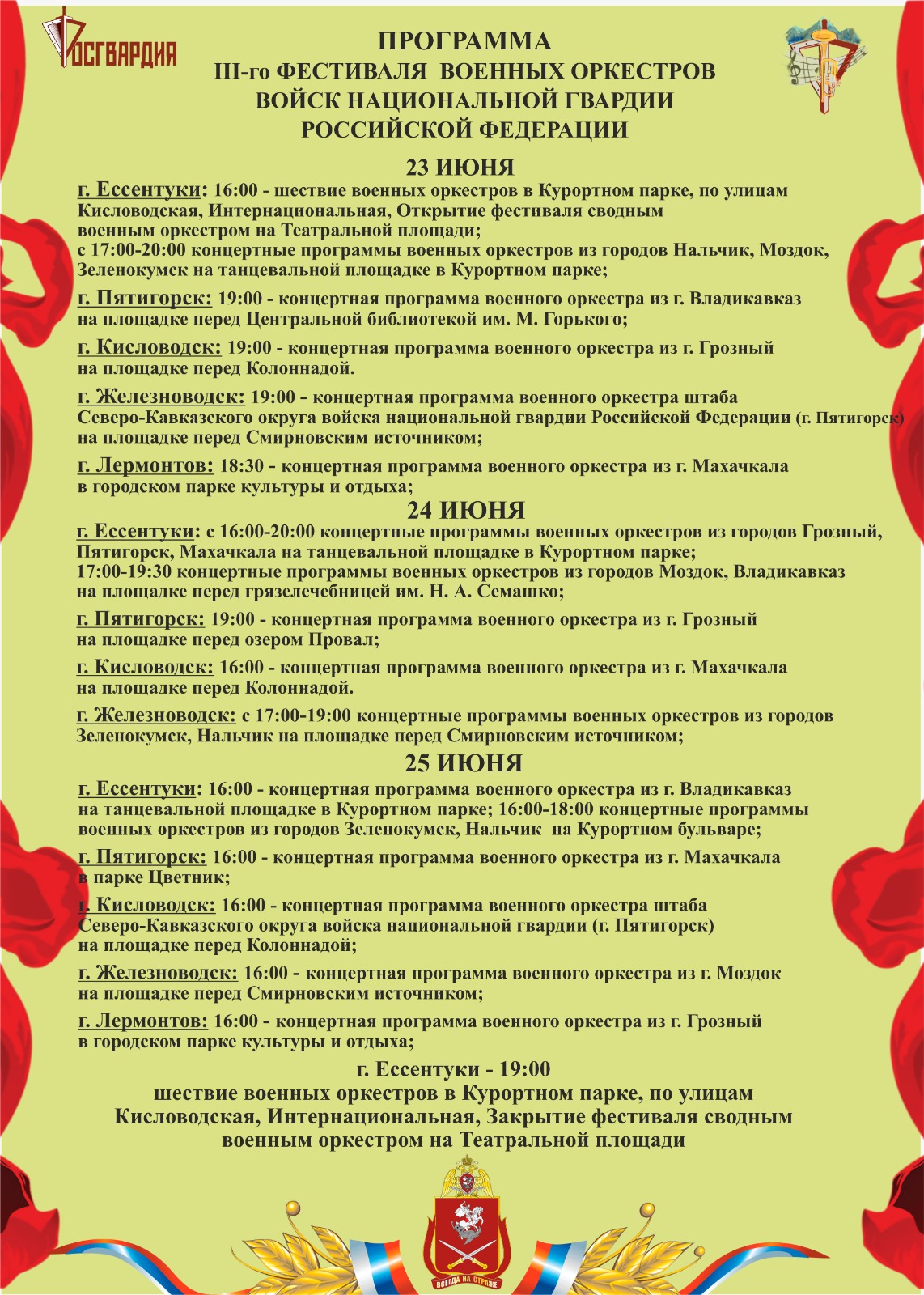 В рамках III Всероссийского фестиваля военных оркестров войск Росгвардии «Музыка. Кавказ. И блеск военной меди» в течение трех дней на общественных и танцевальных площадках Пятигорска дадут концерты творческие коллективы Северо-Кавказского округа войск Росгвардии.