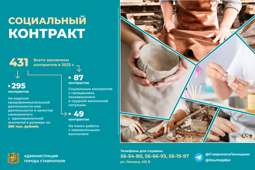 Более подробную информацию о заключении социальных контрактов можно получить в комитете труда и социальной защиты населения администрации города (ул. Ленина, 415 Б). Телефоны для справок: 56-54-80, 56-66-93, 56-19-97. Кроме этого в Телеграм работает путеводитель по государственным и муниципальным услугам @СтавропольПомощник @StavHelpBot. Чат-бот поможет гражданам найти необходимую информацию.