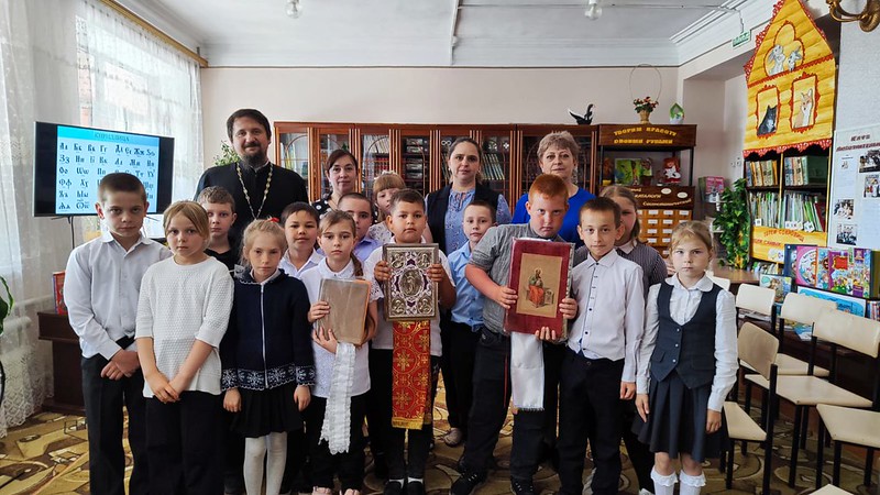 Отец Валерий рассказал детям о первопечатнике отце Иоанне Федорове издавшем в 1564 году на Московском печатном дворе первую печатную книгу Апостол, дети смогли сравнить буквы современного русского алфавита с церковнославянскими буквами попытались прочитать текст Священного Писания.